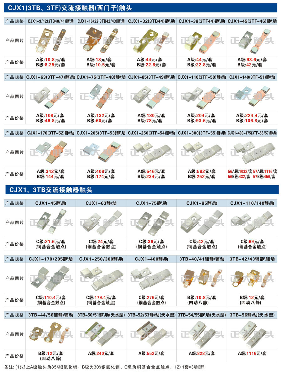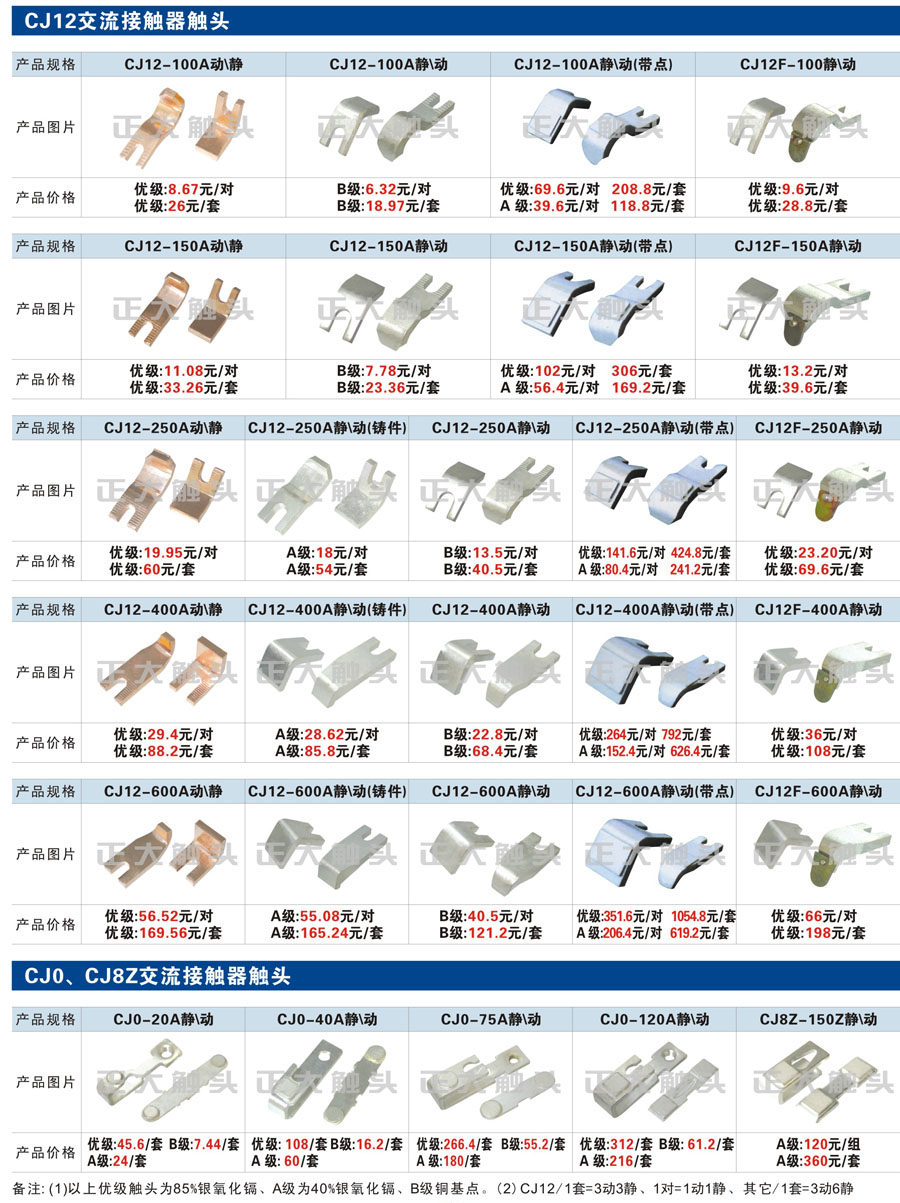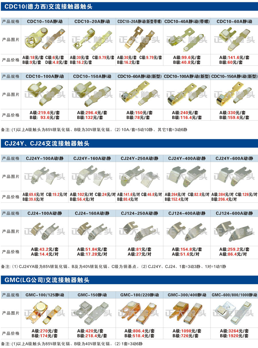 触头元件作为电器开关核心元件,主要用于接触器,继电器,断路器,凸轮控制器,补偿器,行程开关,脚踏开关,辅助开关等。正火电气现生产CJT1,CJX1,CJX2,CJX4,CJX5,CJX8(B系列)CJ20,CJ40,CJ12,CJ15,CJ24,CJ24Y,CJ0,CDC10,CJ91,CT91,CJ913,CJ914,CJ3,CJ8Z交流接触器触头,CZ0,CZ1,CZ3,CZ17,CZ18,CG5直流接触器触头,QJ3,QC83补偿器触头,凸轮控制器,主令触头,KT10,KT12,KT14,KTJ1,KTJ5,KTJ6,KTJ15(QT5),LK1,LK17,LK18,THQ1,TQKT等;断路器触头DW10,DW16,DW15,DW17,DW45,DZ10,DZ20,内燃机触头,矿用触头,叉车,吊车触头,JYN1,JYN2,ZN28,SN10,VS1,梅花触头等。进口ABB系列AF,EH,EK,富士SC系列,日立H系列,施耐德LC1系列,西门子3TF,3TB系列,LG公司(LS产电)GMC系列,三菱机电SN系列。与国内正泰,德力西,天正,人民等,国外ABB,施耐德,西门子,富士,三菱等厂家电气配套。