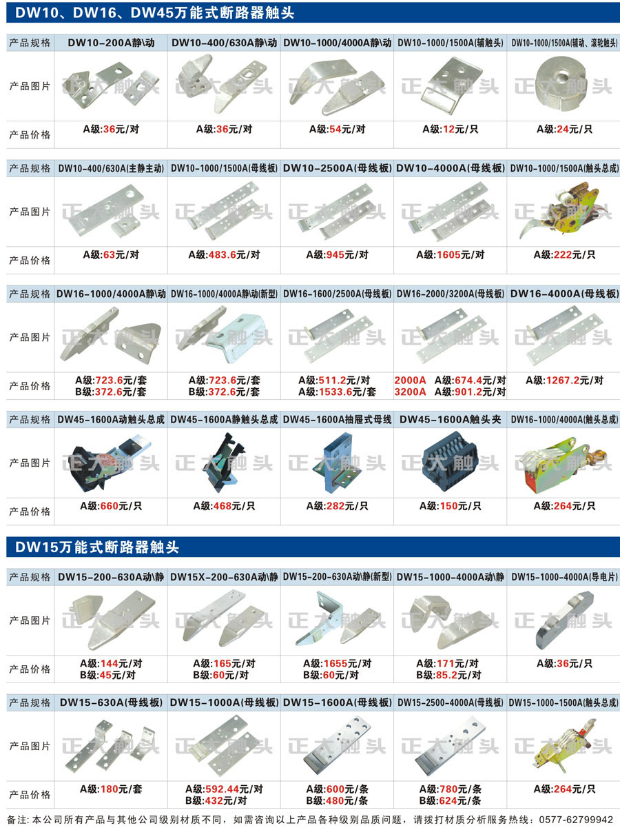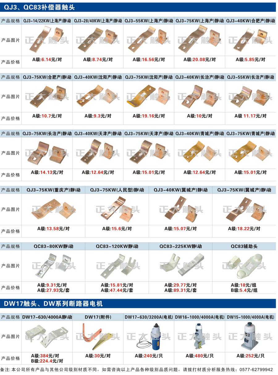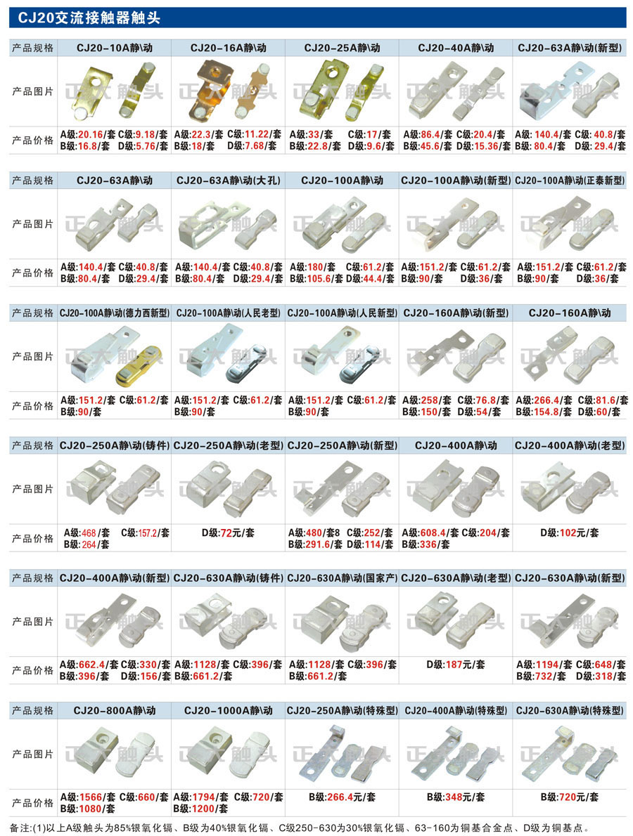 触头元件作为电器开关核心元件,主要用于接触器,继电器,断路器,凸轮控制器,补偿器,行程开关,脚踏开关,辅助开关等。正火电气现生产CJT1,CJX1,CJX2,CJX4,CJX5,CJX8(B系列)CJ20,CJ40,CJ12,CJ15,CJ24,CJ24Y,CJ0,CDC10,CJ91,CT91,CJ913,CJ914,CJ3,CJ8Z交流接触器触头,CZ0,CZ1,CZ3,CZ17,CZ18,CG5直流接触器触头,QJ3,QC83补偿器触头,凸轮控制器,主令触头,KT10,KT12,KT14,KTJ1,KTJ5,KTJ6,KTJ15(QT5),LK1,LK17,LK18,THQ1,TQKT等;断路器触头DW10,DW16,DW15,DW17,DW45,DZ10,DZ20,内燃机触头,矿用触头,叉车,吊车触头,JYN1,JYN2,ZN28,SN10,VS1,梅花触头等。进口ABB系列AF,EH,EK,富士SC系列,日立H系列,施耐德LC1系列,西门子3TF,3TB系列,LG公司(LS产电)GMC系列,三菱机电SN系列。与国内正泰,德力西,天正,人民等,国外ABB,施耐德,西门子,富士,三菱等厂家电气配套。