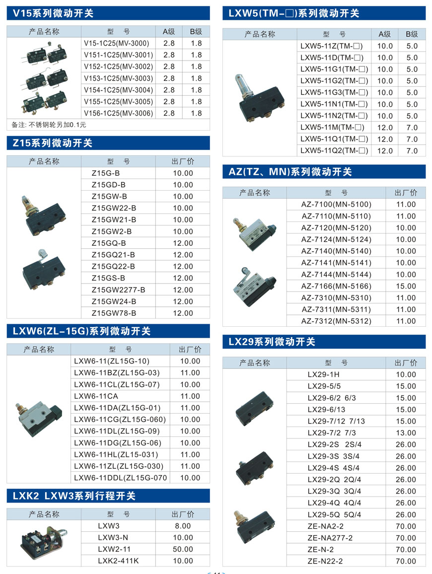 V15、Z15、LXW6(ZL-15G)、LXW5(TM-□)、AZ(TZ、MN)、LX29系列微动开关、LXK2 LXW3系列行程开关