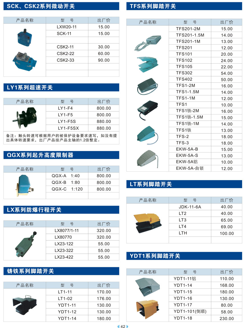 SCK、CSK2系列微动开关、LY1系列超速开关、QGX系列起升高度限制器、LX系列防爆行程开关、铸铁、TFS、LT、YDT1系列脚踏开关